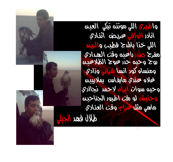 على الرد الجميـــل ولله دركــــــــــــــــــــــــــــــــــــم تقبل مروري وخالص احترامي اخوك/طلال فهد الجبلي |