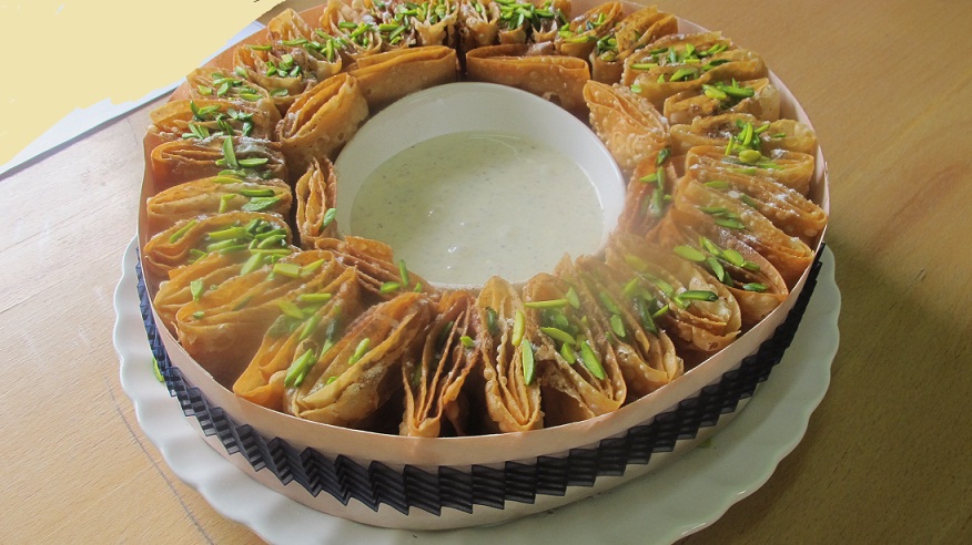 ^ _ ^ هي شرايح السنبووسه اثنيها واقليها واصفها بالصحن وبالنص في صووص عباره عن قيمر وحليب نستله المركز ودارسين وشوي هيل وازين الشراايح المقليه بالفستق بس |